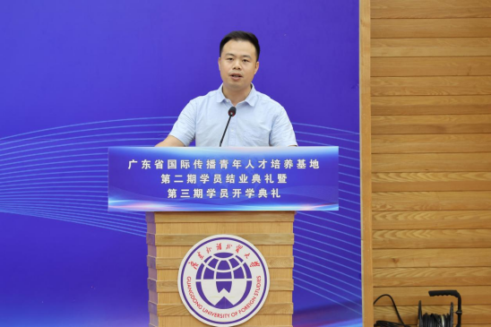 第二届学员代表广州广播电视台导演&编剧&记者、广东省电影家协会副主席谢德炬分享了在基地的学习成果和成长经历。在基地培养期间,谢德炬导演的院线电影《点点星光》获中国电影金鸡奖最佳儿童片、中国国际儿童电影展“最受小学生喜爱”奖等众多奖项。他提到,培训中的每一节集中授课、每一次学员研讨、每一趟实地考察都主题前沿、内容翔实,都具有鲜明的时代特性和现实意义,使之受益匪浅。老师们的授课都能帮助开拓视野、拓宽思路,从而更好地探求国际传播的新路径。他表示,在未来的日子里,希望大家能继续保持联系和合作,用世界可以听得懂的语言讲好中国故事,共同为国际传播事业贡献力量。