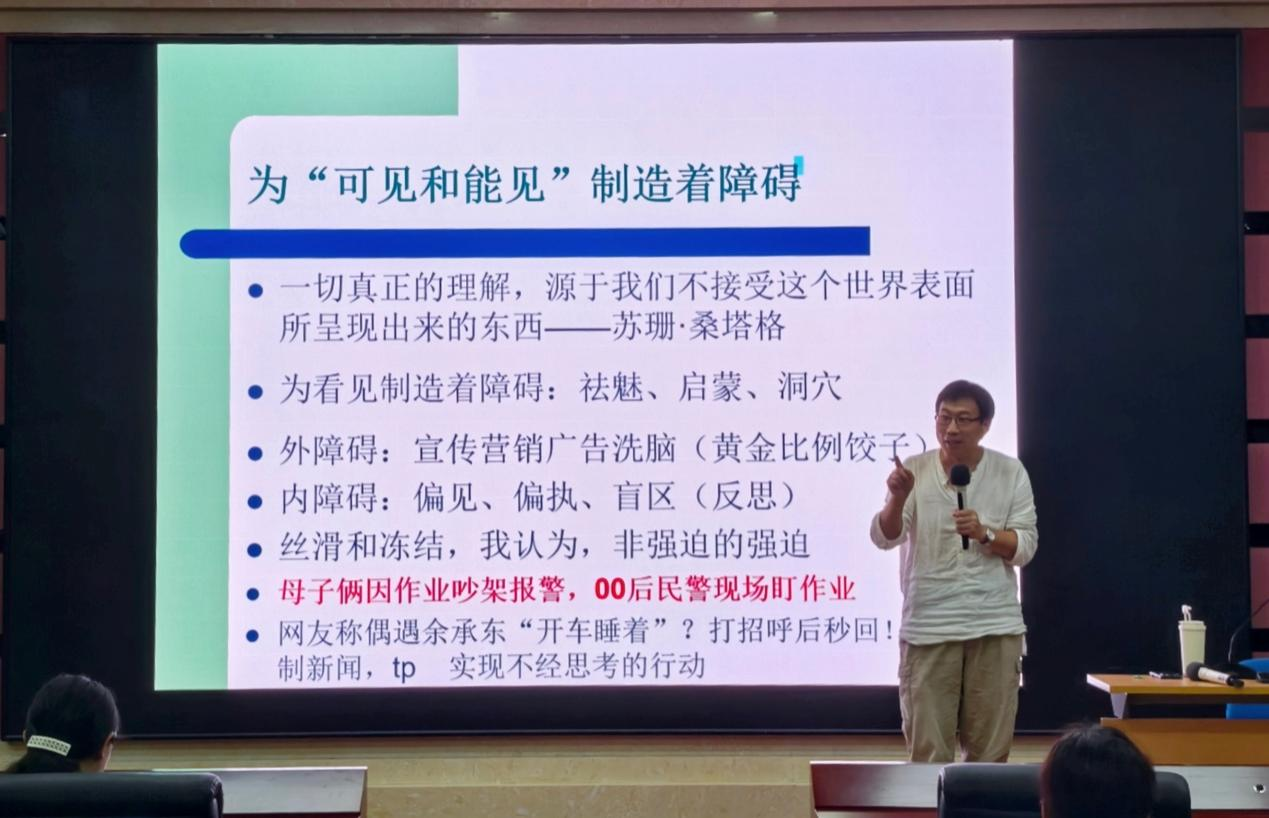 晚间的第二讲《只知其一,等于无知:深度表达的知识支撑》聚焦评论写作的专业性。曹林教授犀利批判学术与舆论中的“空心化”现象:脱离现实的“传播学黑话”、泛道德化的“爹味说教”、碎片拼接的“正确废话”。他援引朱熹“治学如治狱”的治学态度,向同学们强调评论需以扎实知识为锚点,才能让表达穿透表象,抵达“事理融合”的深度,为同学们今后的评论写作提供了宝贵的建议。讲座尾声,他寄语广外学子:“AI能生成流畅文本,却无法替代人类越过认知障碍的思辨过程——那‘断掉的锤子’般的笨拙与痛感,恰是思想的尊严所在。”