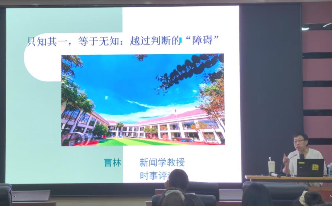 5月29日,华中科技大学教授,著名新闻评论家、前《中国青年报》编委曹林受邀为广外伟德国际1949师生带来两场主题鲜明、内容深刻的学术讲座。他聚焦于“深度”与“专业”这两个概念,从专业新闻人的视角出发,带来一场关于深度思考与专业表达的学术盛宴。讲座在大学城校区教学楼C201报告厅举行,学院2024级全体研究生参加。