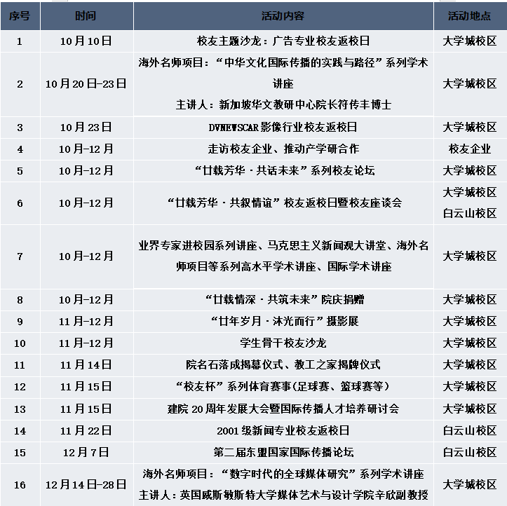 值此国际新闻专业创办28周年、学院建院20周年暨研究生教育10周年之际,学院将以“廿载砥砺 再谱华章”为主题,于2025年10月-12月期间举办建院20周年系列活动。我们诚挚邀请海内外校友重返校园,畅叙情谊,共襄盛举,擘画未来!